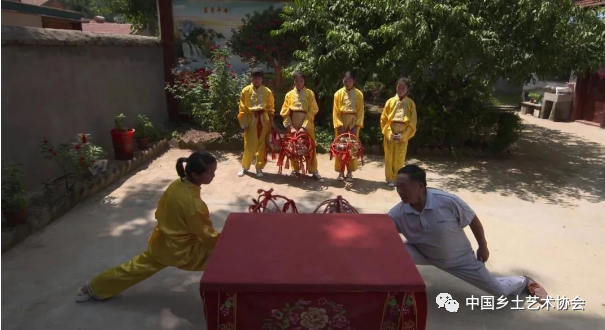 这是麒麟舞表演中难度系数极高的一个经典动作。庞大的麒麟突然跳上桌子,麟尾高高地举起麟头。整个动作一气呵成,惊险而富有冲击力。